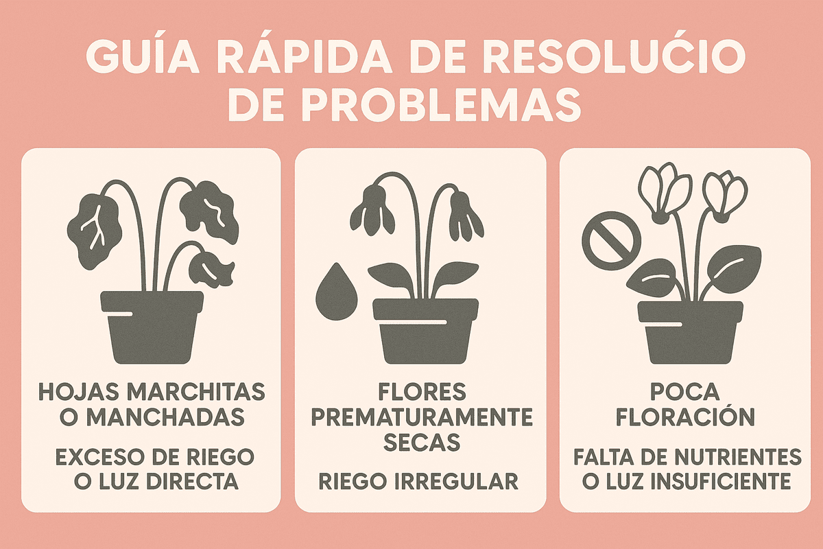 Para prevenir estos problemas, asegúrate de mantener una correcta ventilación, evitar el exceso de agua, retirar hojas y flores dañadas, y revisar tu ciclamen con frecuencia. La prevención es la mejor aliada para disfrutar de una planta sana y en flor.