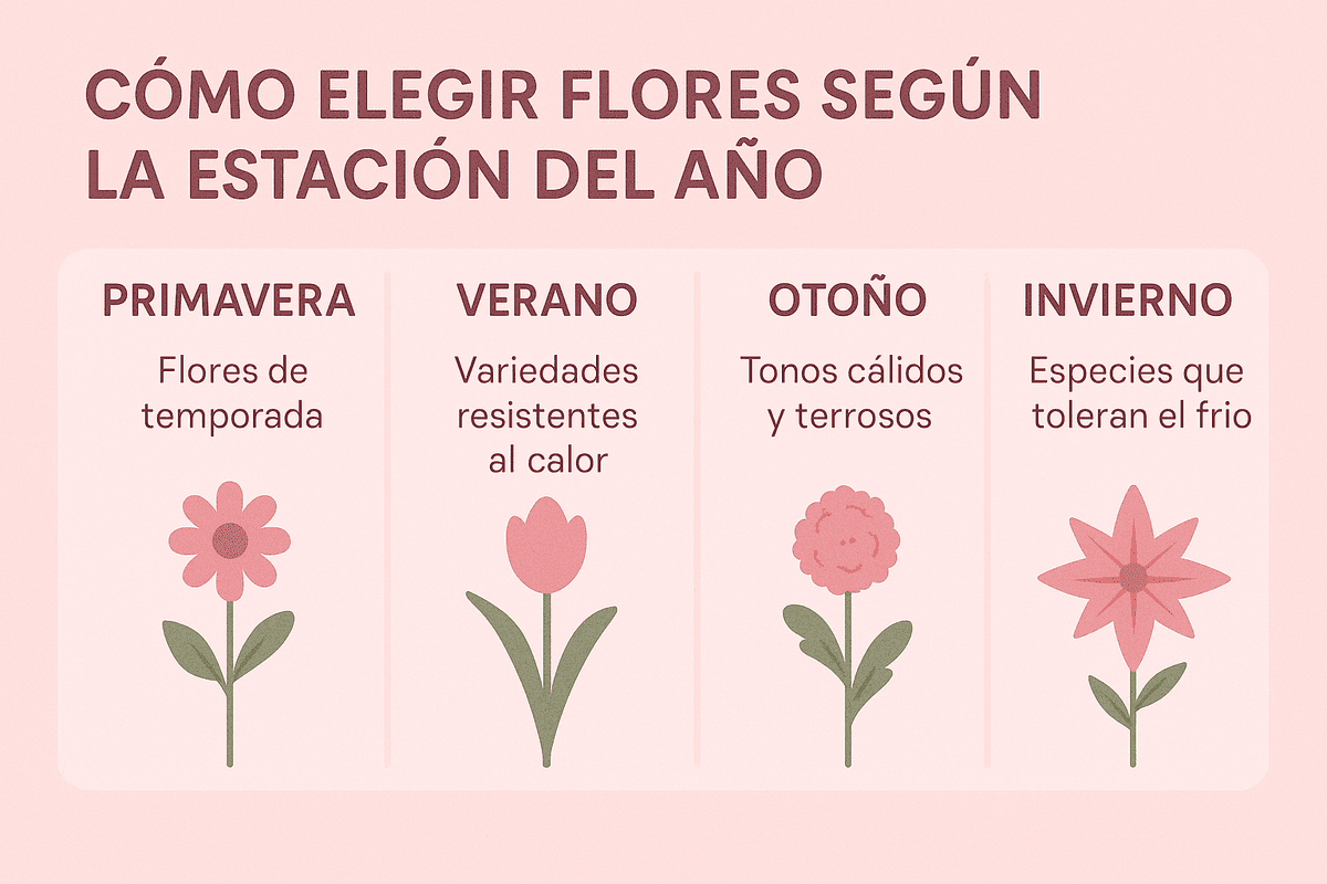 Este cuadro informativo resume lo esencial sobre cómo elegir flores según la estación del año con una visión clara del qué, cuándo y cómo.